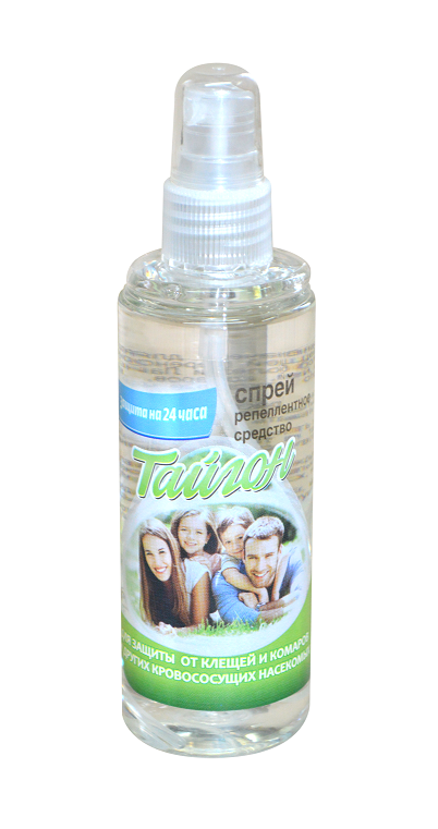 Средство репеллентное "ТАЙГОН" (далее — средство) выпускается во флаконах или в беспропеллентных аэрозольных упаковках с механическим клапаном-распылителем и представляет собой ароматизированный раствор, содержащий в качестве активнодействующего вещества N,N-диэтилтолуамид (ДЭТА, 30,0%), а также спирт изопропиловый (64,8%), полиэтиленгликоль и отдушку. Средство обладает репеллентным действием в отношении кровососущих насекомых (комаров, мокрецов, москитов, мошек, слепней, блох) и иксодовых клещей (переносчиков возбудителей клещевого энцефалита и болезни Лайма), относится к высшей категории эффективности репеллентных средств. Время защитного действия: от насекомых при нанесении на кожу — более 4 часов, при нанесении на одежду и другие изделия из ткани — до 30 суток; от клещей при нанесении на одежду — до 5 суток. Средство предназначено для защиты людей от нападения иксодовых клещей (переносчиков возбудителей клещевого энцефалита и болезни Лайма) и кровососущих насекомых (мошек, слепней, комаров, мокрецов, москитов, блох) при нанесении на открытые части тела, одежду и другие изделия из ткани.